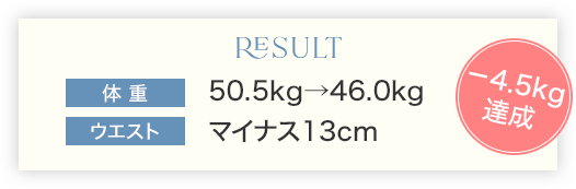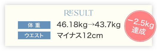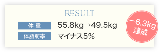 3ヶ月で55.8kgから49.5kgと体重-6.3kg、体脂肪率-5%でした。目標は52.8kgだったんですが、まさか自分が40kg代に到達できるなんて夢にも思わなかったので、目標以上の結果を出して頂いたきとても満足しています。